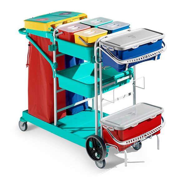 E' composto da una base in plastica grande con ruote standard Ø 100 mm, 2 montanti in Rilsan su cui sono agganciate 2 vaschette grandi per il posizionamento di 4 secchi colorati