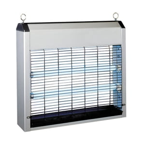 Costruita in alluminio, appesa al soffitto cattura gli insetti grazie ad un cartone collante doppio posto in mezzo alle 4 lampade UV.