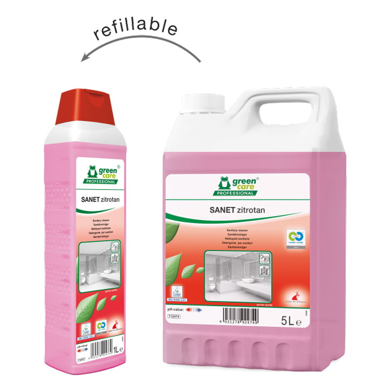 SANET zitrotan è un detergente acido per la manutenzione dei sanitari che utilizza efficacemente il naturale potere acido del limone. Rispettando i cicli biologici, viene prodotto nel rispetto della salute delle persone e della sicurezza degli operatori.