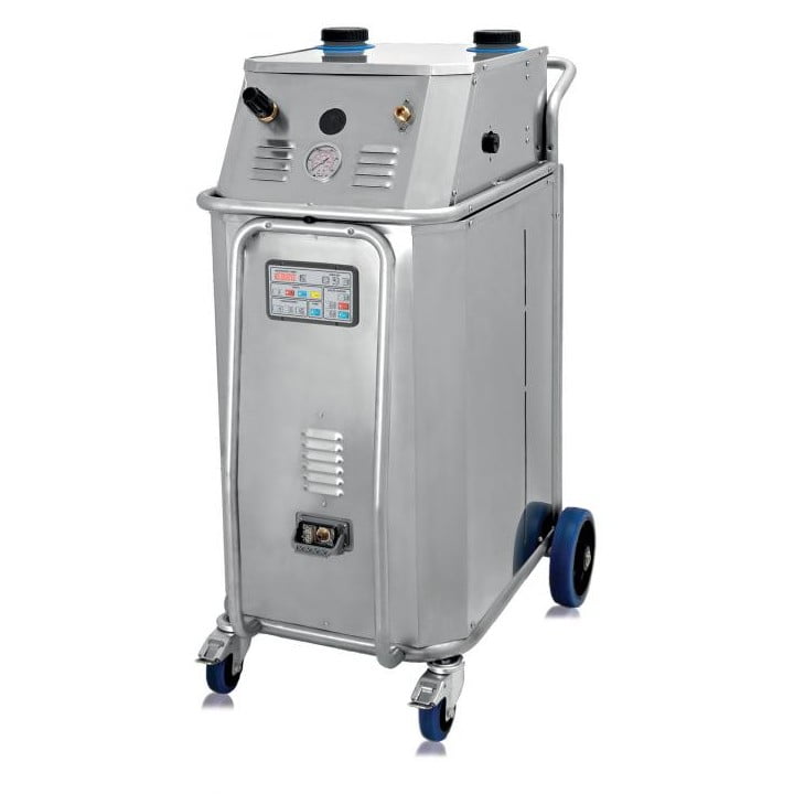 GENERATORE DI VAPORE TRIFASE con telaio tubolare e carrozzeria in acciaio inox con grado di protezione IPX5, sistema di ricarica automatica con controllo elettromeccanico livello acqua in caldaia – True Temp™, cambio pressione 6/10 bar, attacco per rete idrica.