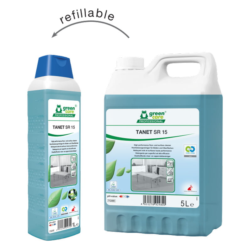 TANET SR 15 è un detergente di manutenzione ad altissime prestazioni per pavimenti e superfici con eccellenti proprietà ambientali. Viene prodotto rispettando i cicli biologici, la salute delle persone e la sicurezza degli operatori.
